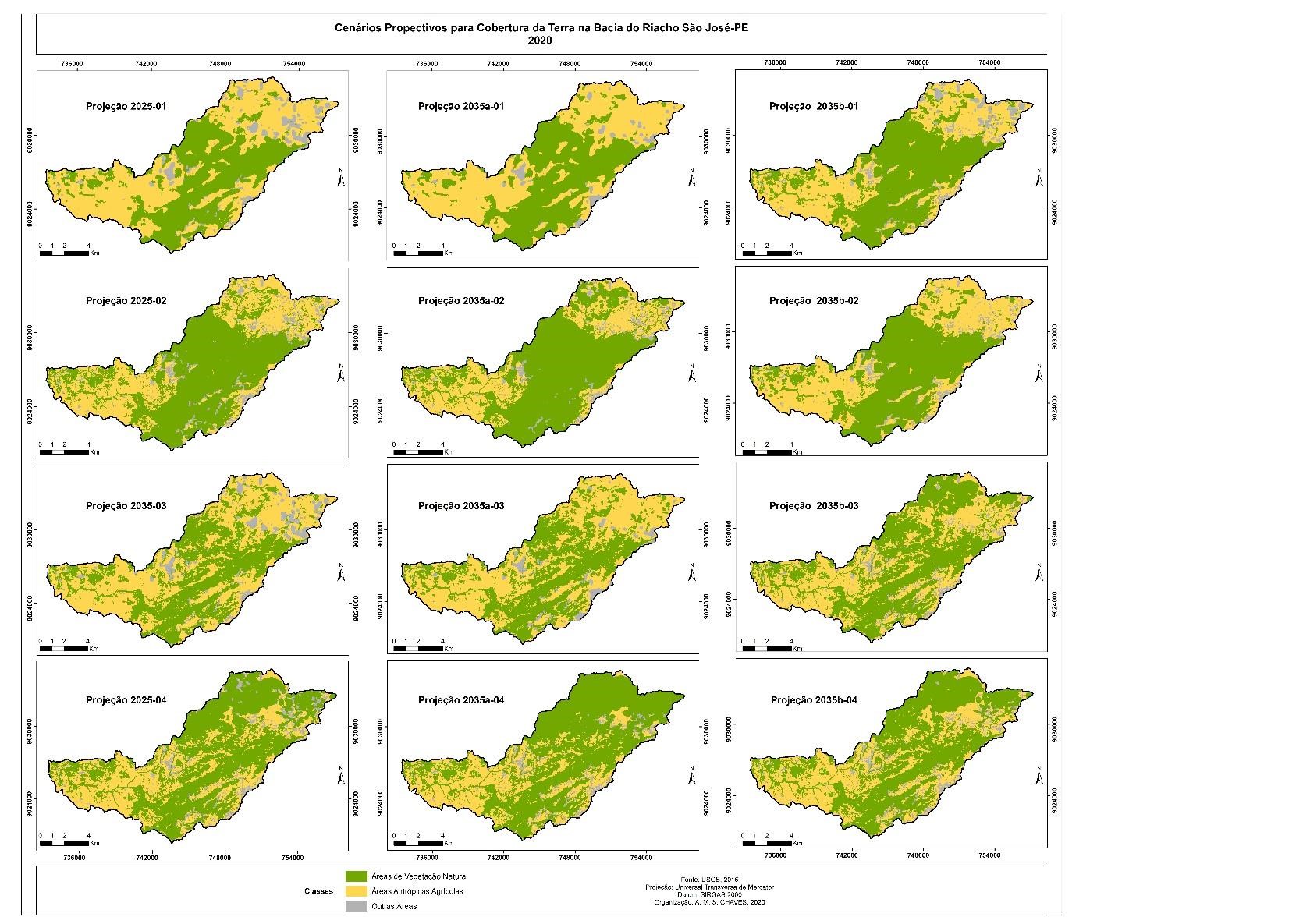 Cenários preditivos na literatura compreendem a probabilidade de como a realidade pode se apresentar no futuro. A perspectiva de cenários preditivos adotados para a bacia do Riacho São José foi prospectiva com vista a conservação da paisagem, ou seja, a descrição de possibilidades de como o futuro pode se apresentar a partir de hipóteses plausíveis, tendo por base as áreas de proteção permanente (APP) dos cursos hídrico e a legislação.